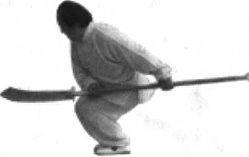 (2)接上式,右脚向前并左脚,身向下 蹲;同时,右手握上把向前下劈,刀头朝前 刃向下,高与小腹平;左手握下把向左侧后 带,把尖朝后,眼视前方(图8-21 )o