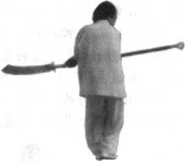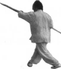 横摆,把尖朝前斜向上;右手握上把向右侧后带,刀 头朝后斜向下刃向外,眼视前方(图8-18)o