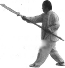 爆发力迅猛快捷,气与力合,力达刀头。此式配 合劈刀进行攻击,攻防兼备,当刀下劈时把尖从下突 然向上横摆,出其不意,攻其不备。把尖横摆时刀头 从攻变守藏在后,变势巧妙,近战威力大。