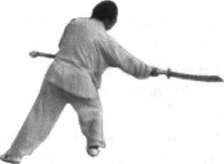 接上式,左脚向后自然调整,右脚在前自然调整;同时,两手握 把向左侧带,刀头向左侧上撩,刀头朝上刃向后,眼视前方(图 8-15)o