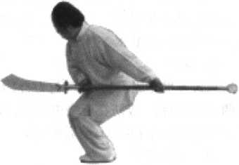 图 8-16图 8-16接上式,左脚向右脚后倒插;同时,两手握把刀横 向下劈,刀头朝后刃向左,眼视右侧(图8-16)。