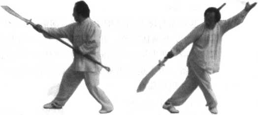 二式连贯完成, 动作舒展大方,刀身 高度协调,气与力合, 力达刀头。指上打下, 声东击西,先蹄击上 部,等对方撩架时即 顺势上撩后带,下翻 攻其下。