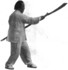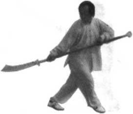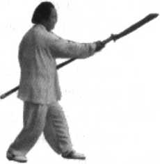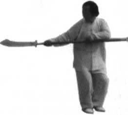 接上式,左脚后退并右脚,两腿微弯;同时,右手 握上把向右侧后带,刀头朝后斜向下,刃向右;左手握下把向前上横摆,把尖朝前斜