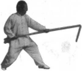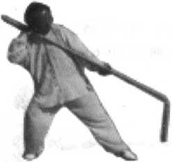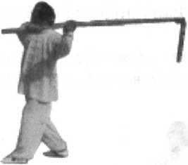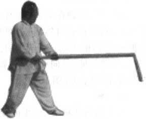 棍梢横带化其力,以防守为主。利用旋体惯性 棍把突然向上横摆攻其上,出其不意,攻其不备。此 式发力迅猛,近战威力大,前后呼应,攻防兼备。