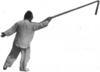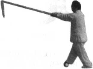 接上式,左脚向前寸步,右脚向前上一 步;同时,右手握棍把斜向前上伸,身向前 倾,梢尖朝前斜向上,左手脱把向身后伸展, 眼视前方(图10-11)。