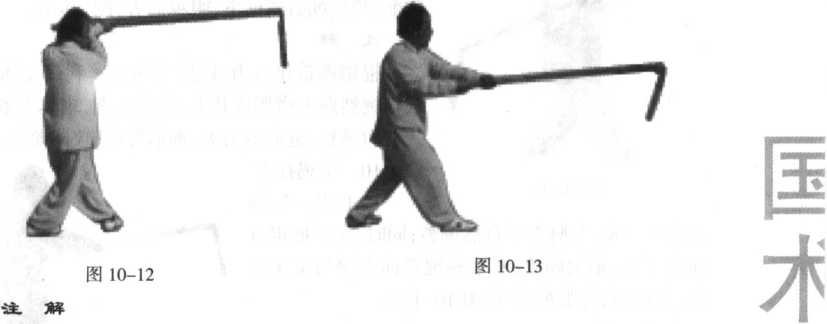 图 10-8图 10-8梢尖向内旋绕一圈,眼视前方(图10-10)o梢尖向内旋绕一圈,眼视前方(图10-10)o图 10-9图 10-9图 10-10图 10-10(2)接上式,两脚前后不变自然调整;同时,右手握棍把,左手握棍身,身法带动