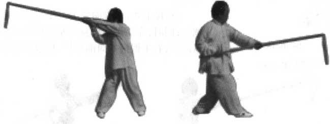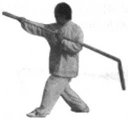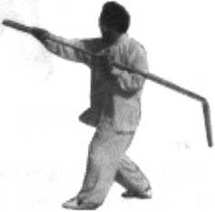 (3) 接上式,左脚向前上一步,右脚在后自然 调整;同时,左手滑握棍身向左侧后旋,梢尖朝后 斜向下;右手握棍把向前横摆,棍根朝前斜向上,