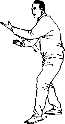 ①右脚向右后外摆,膝盖微屈,重心仍在左腿。右掌掌心 向下,向右后方刁捋(图4—55)O