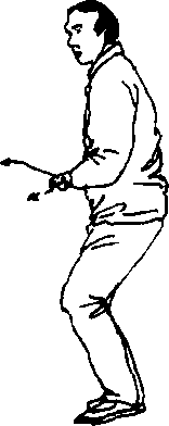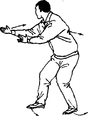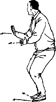 ⑤上动不停,震左脚,右脚平靠在左脚旁。同时向外翻掌, 两掌心相对,掌指外张,两掌根紧靠腹部;两臂屈肘,肘不离肋 (图 4—59)。