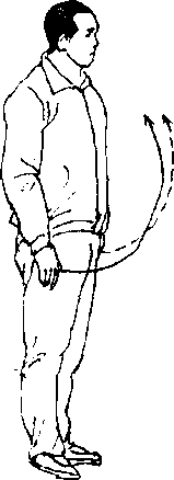 身体直立,半面向右;两肩自然下垂,两手微屈,五指并 拢,小指贴于腿部中间;两脚跟并拢,左脚尖顺直对正前方,右 脚尖向外斜成45。;身体看斜而有正,看正而有斜;目视前方 (图 2—1)。图2 — 1要点:图2 — 1①神态自然,内心空空洞洞,浑然一体,动静无知,凝神敛 气,宛如立於空虚之地。②头要顶,项要竖,下须微向内收,舌顶上颤,松肩垂肘, 含胸拔背,提肛卷尾。