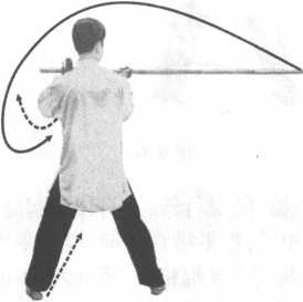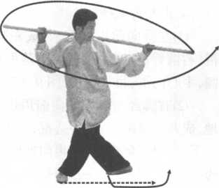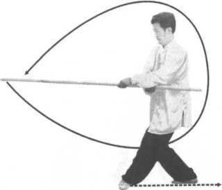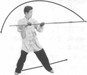 步;右手持棍内旋,使棍尖上起,向左绕行,再向下、向身右侧划弧 拦截,手心向下,棍尖平直向身左前,左手外撑上起立掌,掌心向