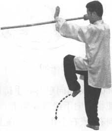 左膝提起与胯平高,左脚盘于右膝前,脚尖向右下,成右独立