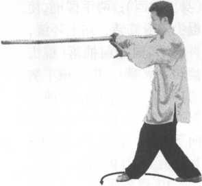 左后(南)倒插步,身向右转动 90° (身面向北),成左脚横右 脚顺两腿交叉步;两手握棍, 使棍尖向上、向身前扣棍,棍 尖直向前;两手交叉握棍在身 左侧,右手在后,手心向上,左 手在前,手心向下;目视棍尖 (图 9-92 )o