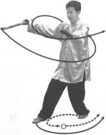 身体腾起向右转体180。,两脚离地腾空换步后同时落地,右 脚落至左脚原位置,左脚落至右脚原位置,两腿屈膝半蹲成马步式 (身面向西);两手握棍,使 棍尖随身旋转,向上环绕, 再向下、向左前抽落(棍尖 摇转一周圈),棍平横于胸 前,棍尖平直向身左;两手 握棍在胸前,右手在右,手心 向下,左手在左,手心向上; 目视棍尖(图9-91 )0
