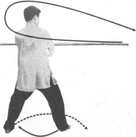 图 9-85图 9-85接上式,两手持棍不变; 左脚经右脚内侧向身后横跨 一步,身向左转90。房面向 西),两腿屈膝半蹲成马步式; 然后身体腾起,右脚向左脚外 侧换步,两脚离地腾空换步后 同时落地,身向左旋转180。 (身由面西转向面东),成半马 步式;右手持棍随身左转,使