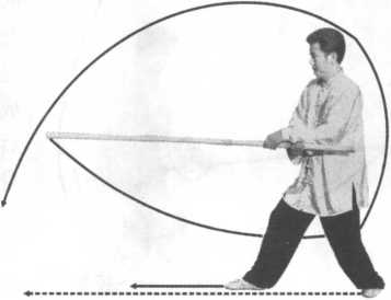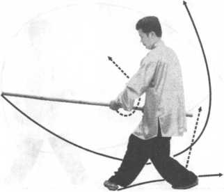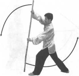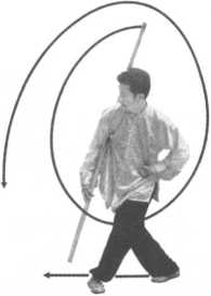 左脚向前外摆落地,上身向左拧转,成左脚横右脚顺交叉步; 右手持棍向左前摆把,棍身在右臂后斜向右上;右手持棍在腹前, 手心向后,左拳收于左腰处,手心向上;目视前方(图9-95)o