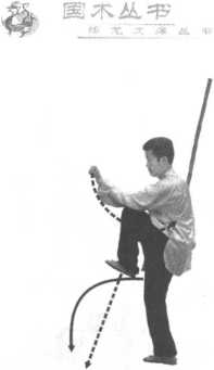 图 9-93图 9-93右脚经左脚内侧向后撤一大步;右手持棍,左手向前滑动扶 棍,随右脚后撤,使棍尖由前向下、向右后上绕行,棍把则向上、向 前下绕行;棍把绕至身右胯后 处时,左脚撤至右脚内侧屈膝 提起,膝与胯平高,脚尖向前, 成右独立步;右手持棍至右胯 后处,虎口向上,手心向内,棍 身贴靠在身体右侧右臂内,棍 身竖立,棍尖微斜向前上方; 左手协扶棍于右腋下后,向前 划弧回收变拳,前臂屈肘向前 竖立,肘置于左膝上,拳心向