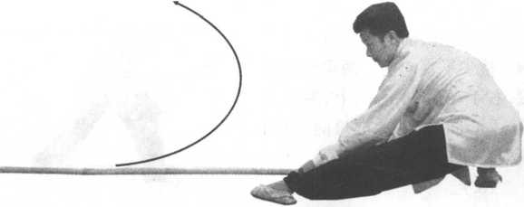 前平铺使棍身向身前扑地劈打,棍身平放于左腿内侧;两手握棍在 左腿内侧;目视棍尖(图9-97 )□