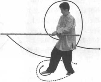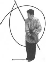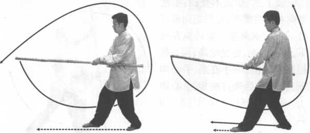 图 9-100 图 9-101图 9-100 图 9-101左脚向前垫一小步,右脚跟至左脚内侧离地虚踩,成左独立 步;左手向前滑动握棍,右手持棍使棍把上起向前、向右下弧形绕
