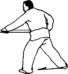 (1)接上势,左脚向前方上一步;左手握枪由右向左臂内旋做 拿枪,右手握把臂外旋停于右腰侧;目视前方(图48 — 1)。(2)右脚向左脚后并步;右手握把推轮向前平扎枪;目视前方(图 48 — 2) o[要点]并步、扎枪动作协调一致。