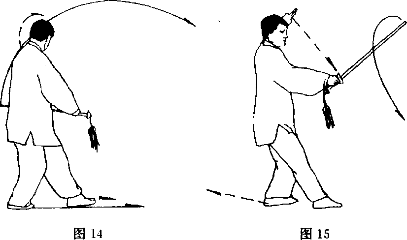 (1)接上势,左脚向右前方上一步;同时上体左转;右手持 剑随之向左下方挂摆至身后;左剑指不变:头向左转,目视剑尖 (图 14)。