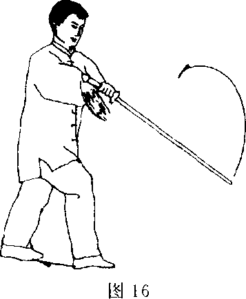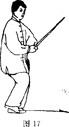 (2) 身体重心移至左腿,右脚随之后撤提于左脚内侧成磨胫 步;同时上体略向右转;右手持剑小臂继续外旋,剑身平刃经左 向上绞转并回抽,至手心向上,剑尖斜向上,高与肩平;目视剑 尖(图17)。