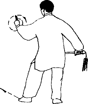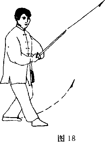 (1) 接上势,右卿向前上一步,重心在左腿,左脚不变;同 时右手持剑略向后收;左剑指仍附于右腕;目平视前方(图18)。