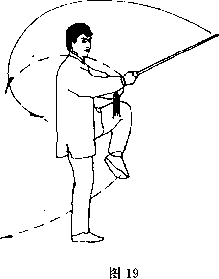 (2) 身体重心移至右腿;左腿随之屈膝上提成右独立步;同 时右手持剑向前平刃刺出,剑尖略高于肩;左剑指后收附于右小 臂;目视剑尖(图19)。