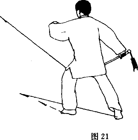 (2) 左脚向前上半步;同时左剑指由外向内绕摆下按;目平 视前方(图21)。
