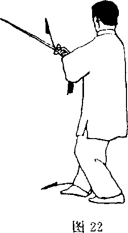 体向左拧转;右手持剑向前症刃刺出,剑尖略高于肩;左剑指后 收附于右小臂;目视剑尖(图22).