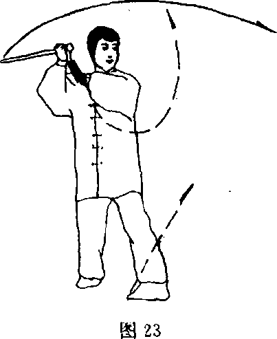 (1)接上势,以右脚掌为轴,身体向左后转;同时右手持剑 小臂外旋,将剑身转至头部右后方,左剑指不变;目视前方(图 23)