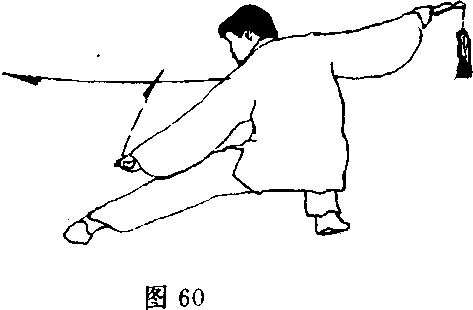 (2) 右脚落地,左脚前伸成仆步;同时右手持剑向右回抽,平 刃置于右臂内侧;左剑指落按于左小腿上方;目视剑指(图60)。