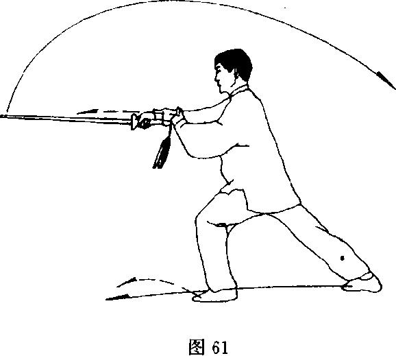 (1) 接上势,上体向左拧转;身体重心前移左腿屈膝,右腿 蹬直成弓步;同时右手持剑由后向前立刃穿刺,剑尖向前;左剑 指屈肘回收附于右小臂;目视剑尖(图61)。