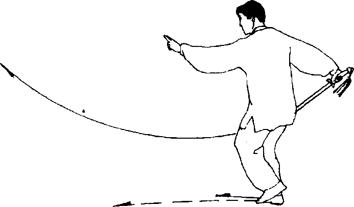 (1)接上势,上体向左拧转;同时右手持剑小臂内旋下落,将 剑前摆至右胯旁,剑尖向前下方;左剑指小臂略内旋;目视剑指 (图 63)。