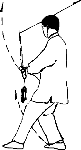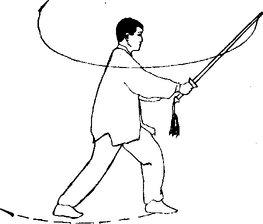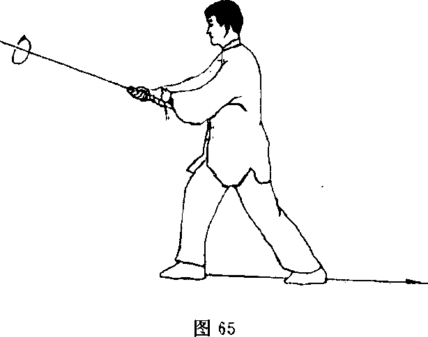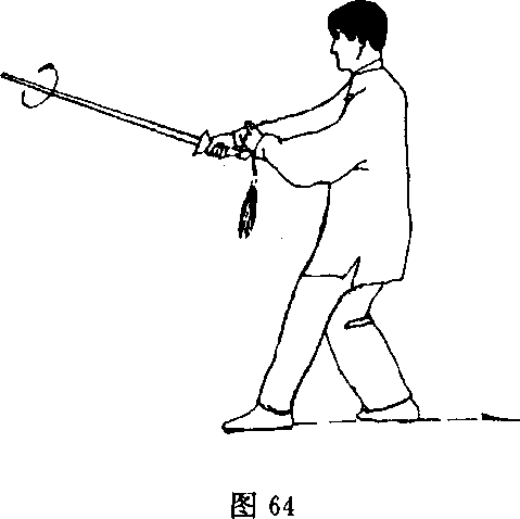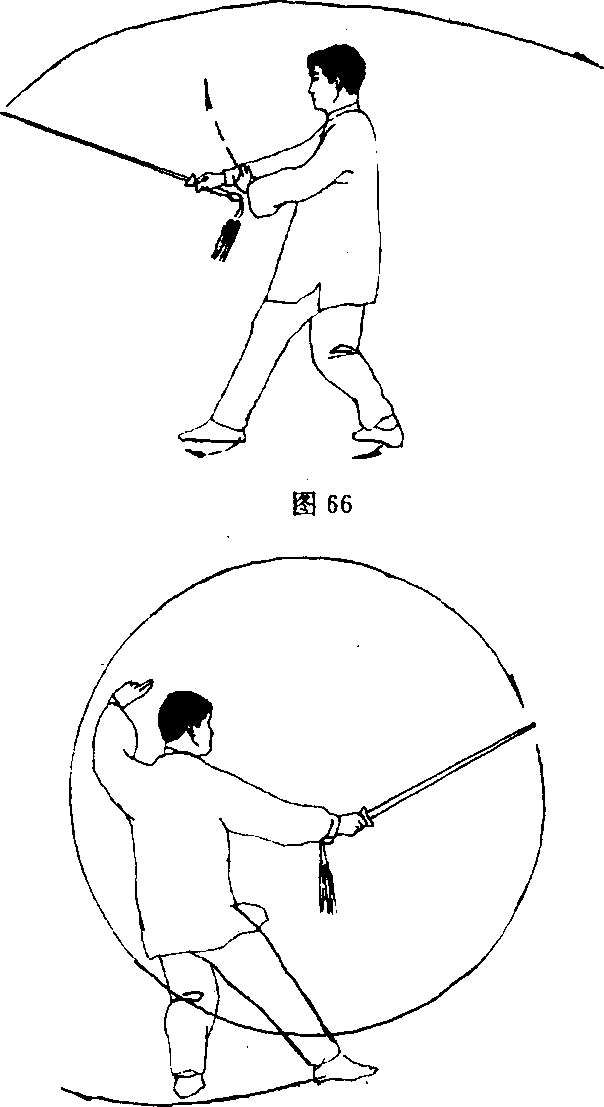 (2) 右脚向右退一步;同时右手持剑继续逆时针绞剑;右剑 指仍附于右腕;目视剑尖(图66)。