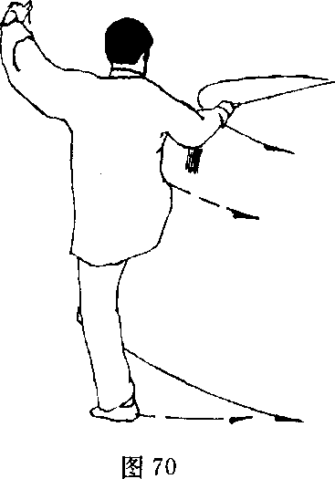 (2) 上体右转,重心后移至右腿,右脚尖外摆;左脚随之向 右扣一步;同时右手持剑随转体向右横摆,剑尖斜向上方;左剑 指不变;目视剑尖(图69)。