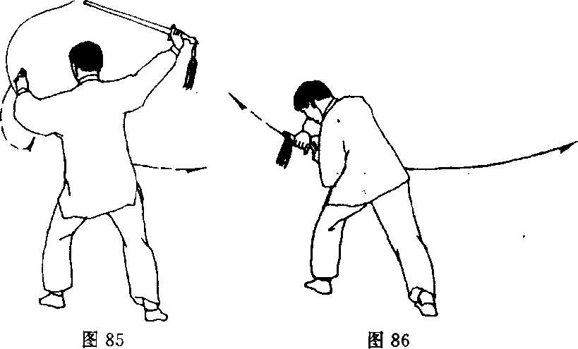 (2) 上体左转前俯;同时右手持剑屈腕由上向下向右转至右 腋下,剑尖向后;左剑指下劈外旋向下划弧并屈肘回收附于右腕, 手心向上;目视剑尖(图86)。