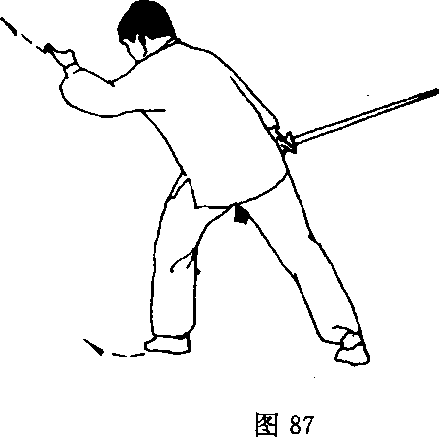 (3)右手持剑反手向后穿出,手心向上,剑尖斜向上;左剑 指向前伸指(图87)。