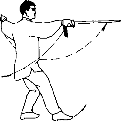 (4)以两脚掌为轴,上体向右后方拧转,成顺三体式步;同 时右手持剑转肩旋臂向前立刃穿刺,剑尖向前,高与肩平;左剑