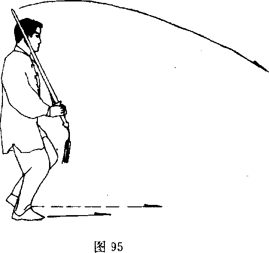 (1) 接上势,右脚向前上一步,左脚跟进提收于右脚内踝侧 成磨胫步;同时左剑指变掌抓握剑柄后端,双手屈臂坐腕下沉,剑 身后带至右肩前;目视前方(图95)。