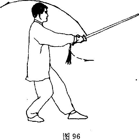 (2) 左脚向前上一步,右脚跟进半步成拗三体式步;同时双 手持剑向前劈出,剑尖高与肩平;目视剑尖(图96)。