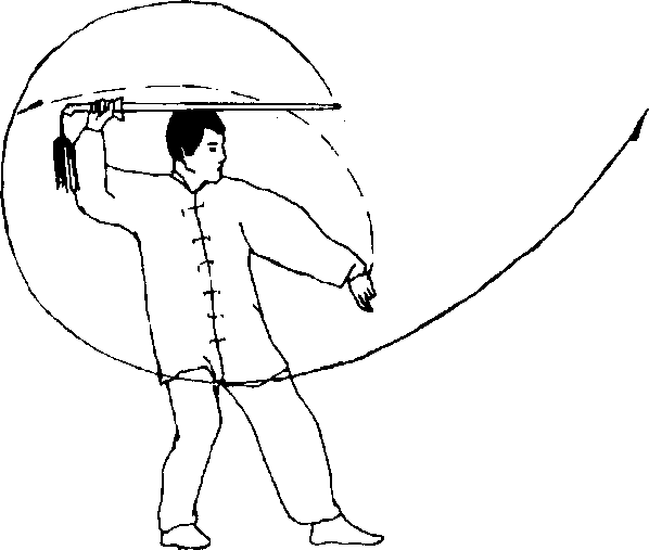 (1)接上势,上体右转;同时右手持剑由前向上向后抽带;左