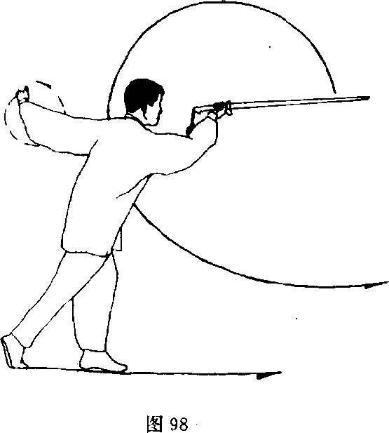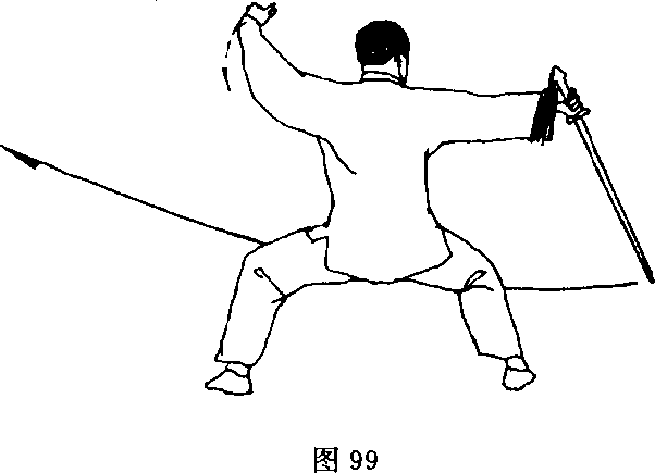 (2) 上体向左拧转,重心前移至左腿;同时右手持剑由后向 下再向前撩剑,剑尖向前,略高于头;左剑指随之经上绕摆至身 体左侧方;目视剑尖(图98儿