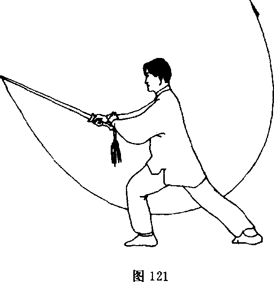 (1)接上势,上体右转,右脚向后退一步,左脚不变屈膝成 弓步;同时右手持剑在身体右侧立圆抡转一周;左剑指前摆附于 右腕;目视前方(图121).