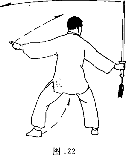 (2) 上体向右转,重心移至右腿;同时右手持剑继续向下向 右甩摆,至身体右侧翘腕,剑尖向上;左剑指随之前伸,手心向 下,指尖向前;头向右转,目视剑尖(图122)。