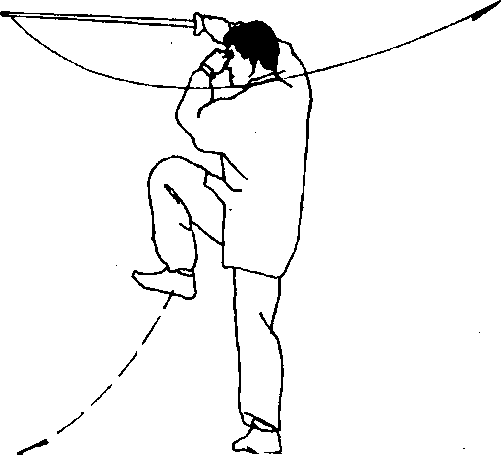 (3) 上体向右拧转;左脚勾脚尖屈膝上提;同时右手持剑继 续上摆并经头部右侧向前反刺,剑尖向前,高与头平;左剑指屈 臂附于右腕;目视剑尖(图123)。