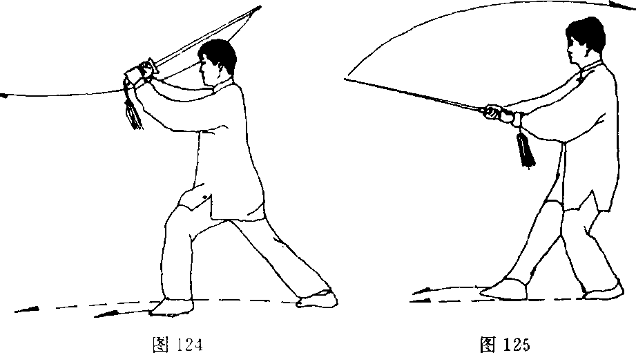 (2) 右脚向前上一步,左脚跟进半步成顺三体式步;同时上 体向左拧转;双手持剑继续向右挥转并向前斜劈,剑尖向前,高 与肩平;目视剑尖(图125)。
