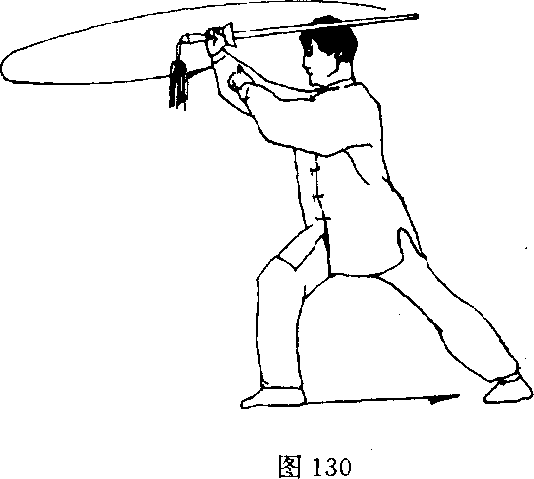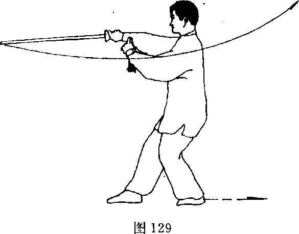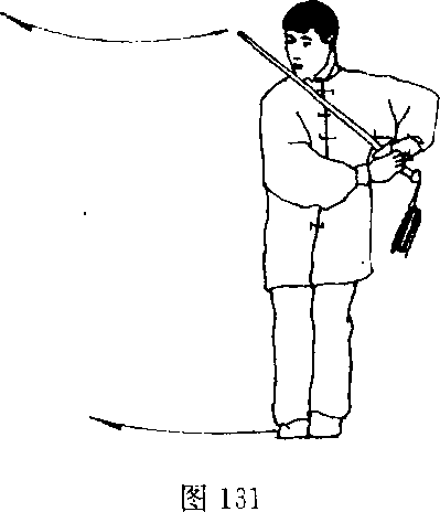 (1)接上势,上体向左转,左脚向后撤半步;同时右手持剑 经左向后平摆云转;左剑指附于右腕;目视前方(图130)o(2)上体向左拧转,右脚向左脚内侧并步,两腿屈膝下蹲;同 时右手持剑继续向右云转并抱于右肋侧,剑尖斜向上;左剑指仍 附于右腕;目视右前方(图131)。? 326 -[要点]云剑要平圆运转;并步抱剑要沉稳。