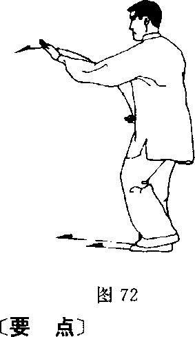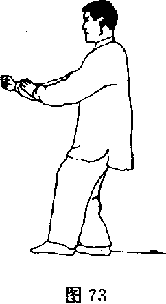 (1) 接上势。上体及两手姿势不变;右脚向后撤半步;目视 右拳(图74)。