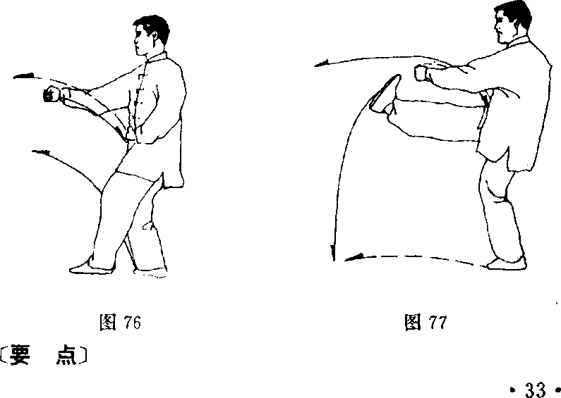 接上势。上体向右拧转,右腿屈膝上提,脚尖上勾向前蹬出; 同时左拳小臂内旋,经右拳上方向前崩出,拳眼向上,高下肋平; 右拳随之小臂外旋,屈肘回收至脐部右侧,拳心向上;目视左拳 (图 77)。